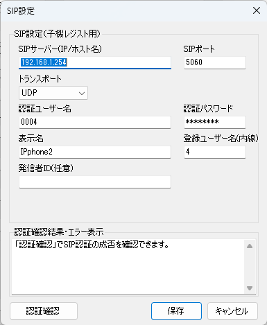 - 機能:入力したSIP設定で認証テストを実行