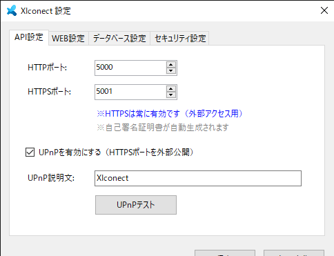 UPnP対応のルータの場合は、UPnPを有効にしてテストボタンを押してください。テスト結果を確認してOkであれば自動でポートの開放設定行えたことになります。