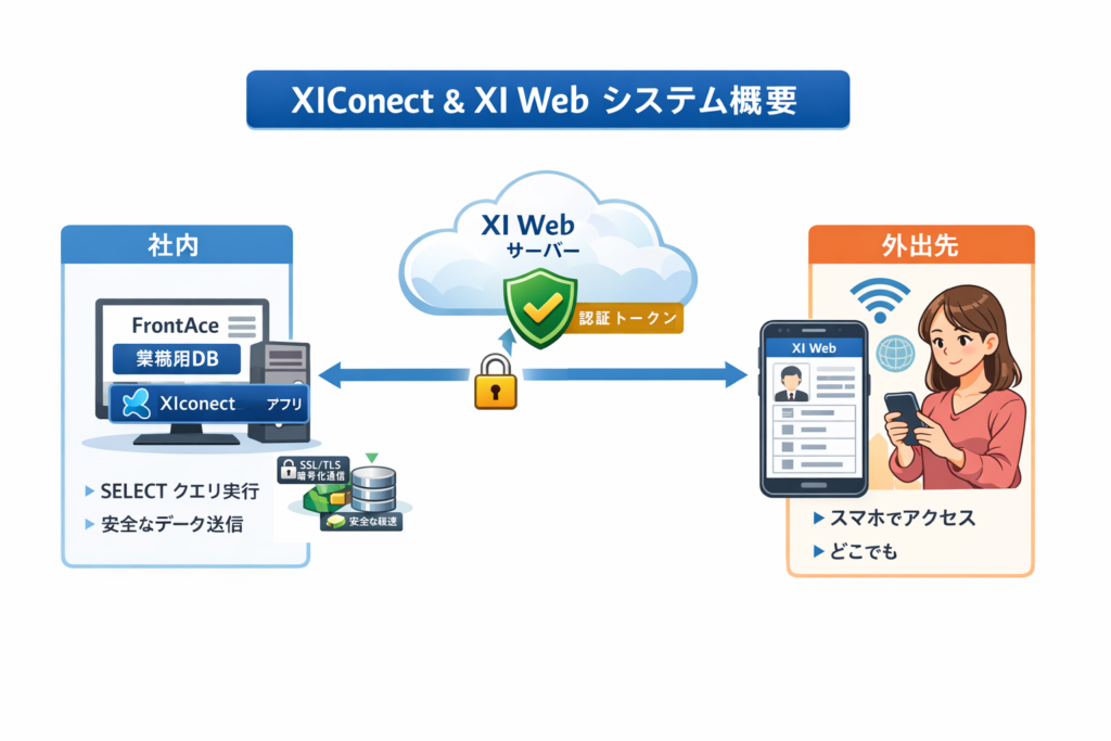 「XI conect」はwindows常駐型のアプリで、いままでオンプレミス型では不可能だったネットからのデータ利用を可能にする。windowsからインターネットへの情報発信を実現する。データー中継アプリケーションです。暗号化通信、認証トークン、データ改ざん防止設定機能によりセキュリティ対策も行っております。後述のインターネット側「XI Web」を通じてFrontAceのデータへ自由にアクセスする事が可能になりました。